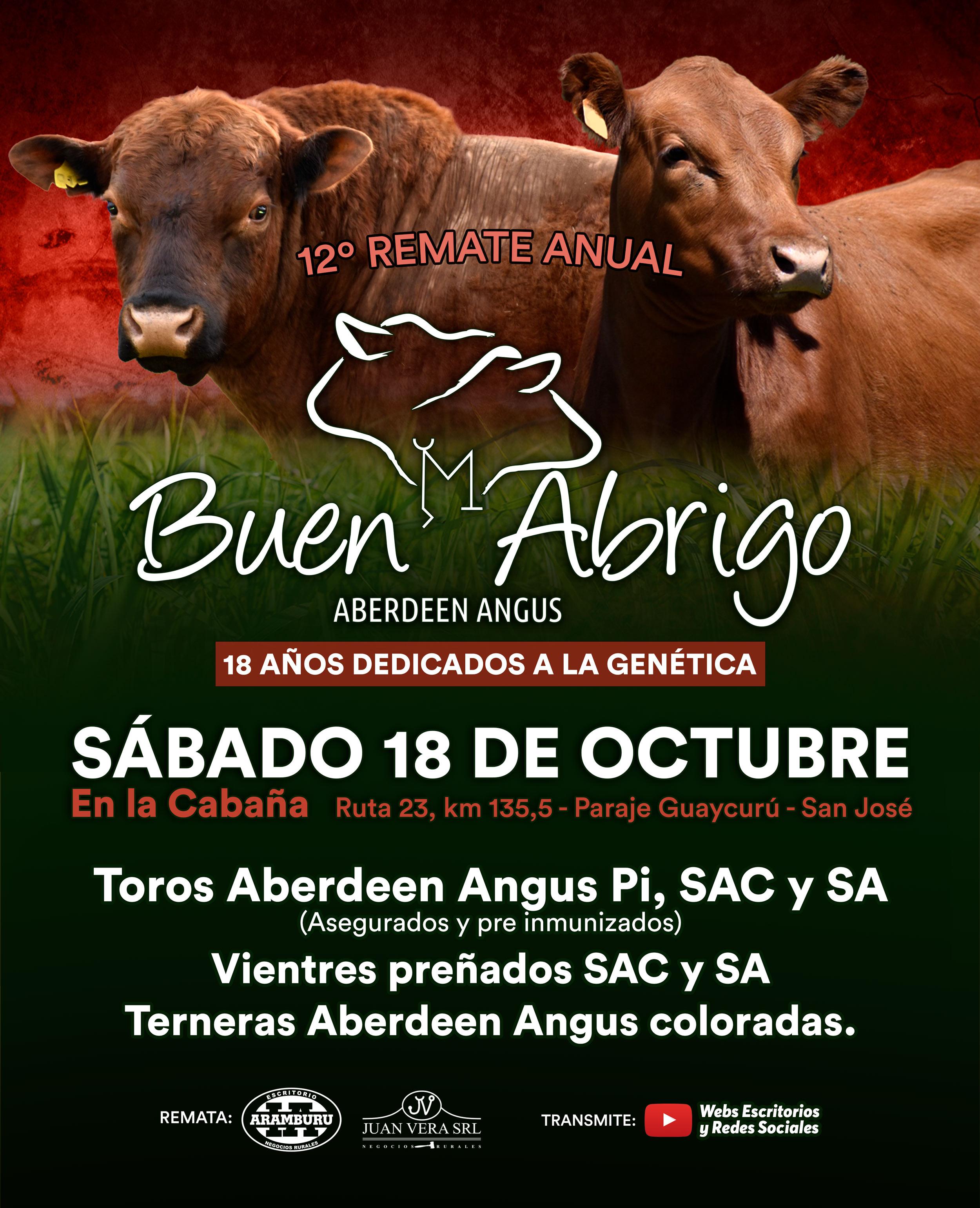 Sábado 18 de Octubre se llevará a cabo el 12º Remate Anual de Cabaña Buen Abrigo en en la propia Cabaña, Ruta 23, km 135,5 - Paraje Guaycurú - San José.
